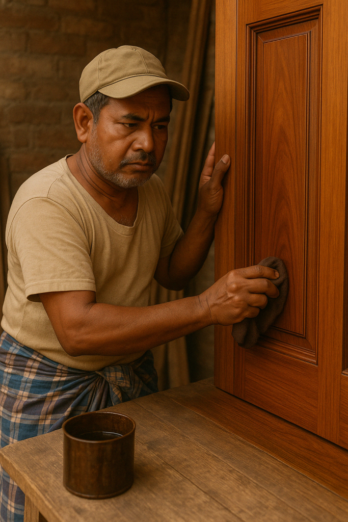 ফলে এই কাজটি সঠিকভাবে সম্পাদন করার জন্য মান সম্পন্ন মালামাল সংগ্রহ করা এবং অভিজ্ঞতাসম্পন্ন মিস্ত্রী নিয়োগ দেয়া অত্যাবশ্যক। অনভিজ্ঞ মিস্ত্রী দ্বারা কাজ করানো হলে অতিরিক্ত রংয়ের প্রলেপ দিয়ে কাঠের আঁশগুলো ঢেকে ফেলে এবং উজ্জলতা ম্লান করে দেয়, ফলে এর নান্দনিকতা হারিয়ে যায়। তাই এই কাজটি করার আগেই সঠিক মালামাল সংগ্রহ করা, অভিজ্ঞ মিস্ত্রী নিয়াগ দেয়া এবং কাজের পদ্ধতিগত ব্যাপারে সতর্কতা অবলম্বন করা অপরিহার্য।